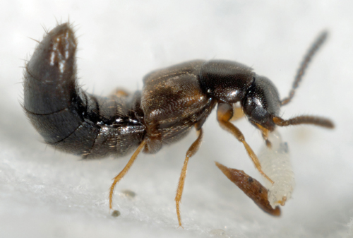 Dalotia coriaria the Greenhouse Rove Beetle, both adults and larvae prey upon larvae of fungus gnats and adult beetles also target shore flies and thrips. The species was discovered feeding on a laboratory culture of fungus gnats, stimulating a study into its efficacy as a biological control agent. Dalotia (formerly Atheta) coriaria, also known as the rove beetle, is used for the control and management of shore flies (Scatella spp, Ephydridae spp), several species of sciarids (fungus gnats) such as Lycoriella spp, Sciara spp, Bradysia spp. and Mycetophilidae family members, thrips pupae (species like Frankliniella occidentalis also known as Western flower thrips), F. tritici a.k.a. flower thrips, and others which drop to the substrate to pupate, springtails (Collembola family members) and moth fly larvae (Psychodidae family). Life-style Dalotia coriaria is a 1/8th in., fast moving, soil-dwelling predatory beetle known for its aggressive feeding behavior. This beetle spends most of it’s time in the substrate but they can also fly. The eggs take 3-4 days to hatch into predacious larvae, which look somewhat similar to the adults. They pupate in silken chambers. Altogether they live for about 21 days at 70°F. They are effective at a wide range of temperatures of between 55-95°F. Benefits They have a wide range of dietary options at their disposal and can quickly react to differing pests without much of a problem. Due to their ability to colonize rapidly, react is an apt word. Their populations should mirror those of their prey after establishment. Being opportunistic, their numbers may stay fairly high in an area such as a greenhouse with a gravel floor or raised beds, or a garden with lots of organic matter. This is definitely a good thing as it may allow for more infrequent releases. Release Rates Use at a rate of 0.5 per sq. ft. Dose may be increased to 1 per sq. ft. to speed up establishment in areas of high infestation, particularly of shore flies.