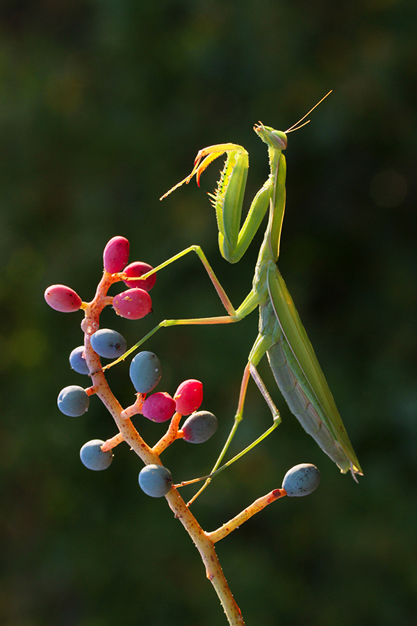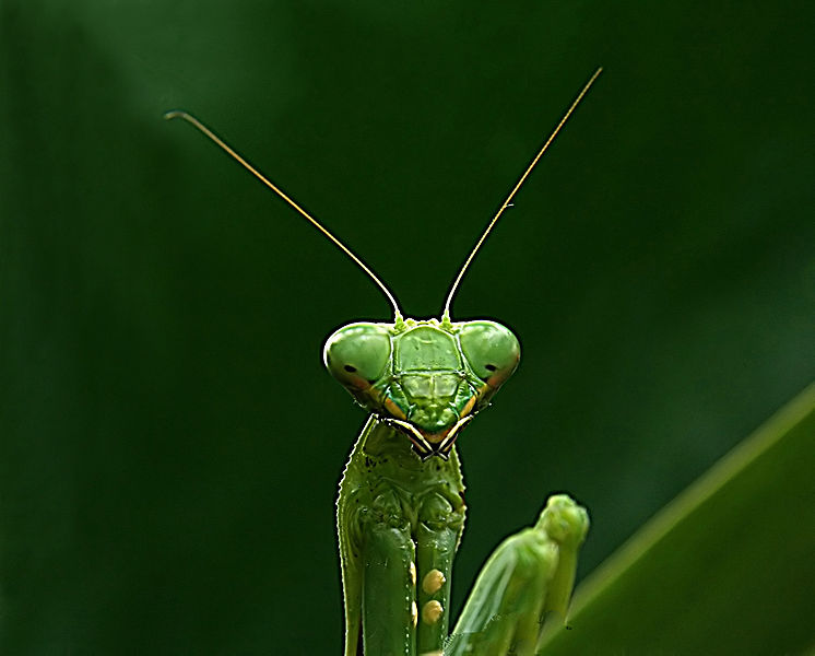 FOOD AND REARING: Providing food for a mantid can easily be done by trapping flies or other insects, and releasing them into the mantid's container; a wide-mouth jar covered with a net or screen on top and a twig or branch inside the jar. Insects used for food must be alive and not much bigger than the mantid. If the insect is too small, the mantid will consistently miss and be unable to grasp the prey. Mantids will eat insects dangled from tweezers, and most mantids will not except dead insects. Mantids in captivity do need additional water. Gently place a small wet sponge inside the container every week. The mantids will gather the water off the sponge.
